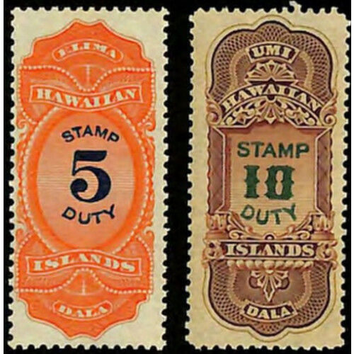 Hawaii Revenue: 1910 $5 vermilion and violet blue, plus $10 reddish brown & green (Scott R15-16), original gum never hinged (U/M), fresh and bright duo.