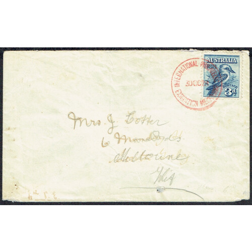 1928 (30 Oct) 3d blue Kookaburra tied INTERNATIONAL PHILATELIC EXHIBITION MELBOURNE cds in red, some cover faults and rub on the stamp. Addressed locally.