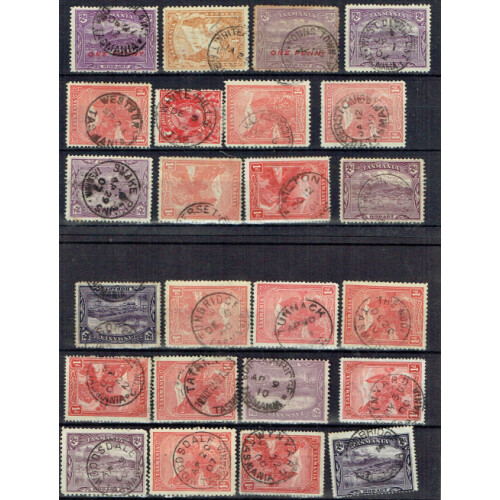 Tasmania: Postmarks on Views issue on leaves interesting assembly of 260+ stamps mostly with readable CDS cancels incl Waratah, Ulverstone, Triabunna, Zeehan, Swansea, T.P.O., Railway, Snake Plains, Fingal, Flinders Island, Eaglehawk Neck, Daniels Bay, Crotty (2), Blythe, Avoca, Mount Seymour, Maria Island, King's Island, Kelso, Golden Valley, plus many more, many good cancels, some part cancels, ideal for continuation, approx 260+.
