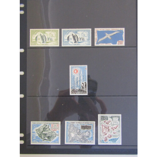French & Southern Antarctic Terr: 1965 (16 Jan) Philatelic larger cover (vertical bend not affecting the stamps) bearing a multitude of better stamps tied by TERRE ADELIE T.A.A.F cds cancels, noted 1956-60 85f (Cat £65), 4f (Cat £55), 8f (cat £70), 10f, 12f (Cat £65), 15f, 20f (cat £65), 25f (Cat £160), 100f & 200f airs (Cat £165), 1960 Kerguelen 25f (Cat £65), 1962 50f air (SG 34 cat £110), 1961 Charcot (Cat £65), 1963 Crozet 5f (Cat £90), 1963 Quiet sun set 2 (Cat £215), 24 stamps Cat £1295. Attractive and unique.