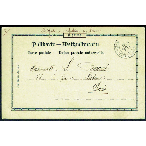 1901 (5 Dec) Postcard Chinese Bauen unstamped postcard sent part CDS of CHINE ARMEES 5 to Paris and manuscript Brigade d'Occupation en China along the top, interesting French soldiers mail.