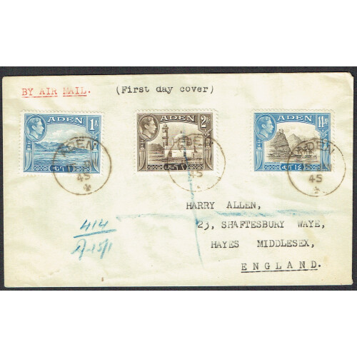 1945 (15 Jan) registered first day cover bearing 1a, 2a & 14a values tied ADEN cds cancel sent airmail to UK.