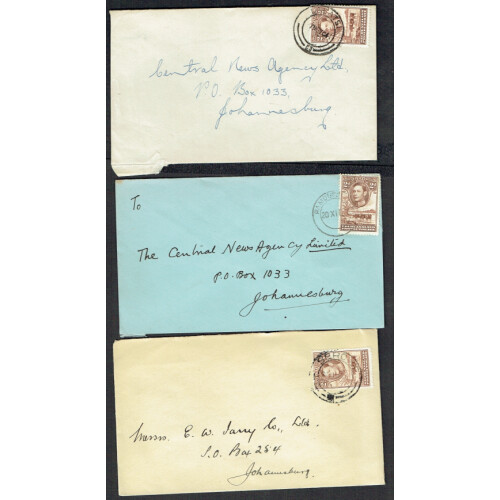 Twenty GVI Covers from an original correspondence to Central News Agency in Johannesburg. Many different postmarks tying GVI 2d brown defin incl LOBATSI, SEROWE (9), PALAPYE, MAHALPYE, FRANCISTOWN, MOCHUDI, RAMOUTSA, most are slit to open out. (20).