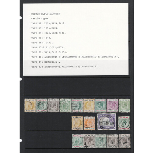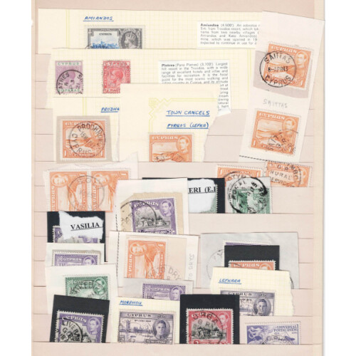 Postmarks: Collection for Cyprus QV-GVI issues neatly arrange and identified on leaves incl duplex numeral 942 (3), 696, 975, 981, 982, 969, D47, QV Larnaca squared circles (20), Famagusta (5), Limassol (5), Nikosia (5), Rizokarpatho, Lefkonia, Lefkoniko, Kithrea, Lefka, then CDS cancels incl Polymedia, Troodos, Kyrenia, Lefkara, more Duplex cancels on 1882-96 (14), EDVII range of cds and squared circles etc. Nice assembly. (Approx. 140).