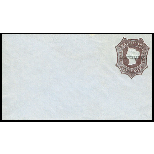 Queen Victoria Postal Stationery embossed envelope 9d brown-purple on bluish paper with CANCELLED overprint as made by De La Rue & Co. Scarce, few white age marks.