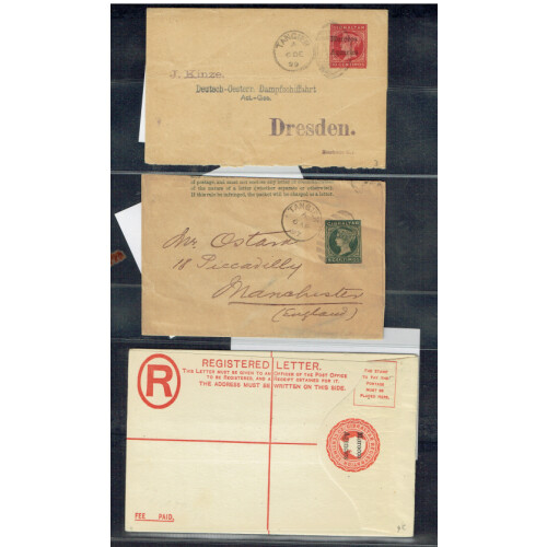 Overprints on Gibraltar QV postal stationery cards, wrappers and envelope including wrapper 5c (2) & 10c unused, 5c & 10c wrapper used, 5c (2) & 10c postal card unused, 5c green postal card cto used A26 Tangier duplex unaddr. , 1d red used Tangier A26 cancel to Huelva, 20c red registered envelope unused. Nice group (12).