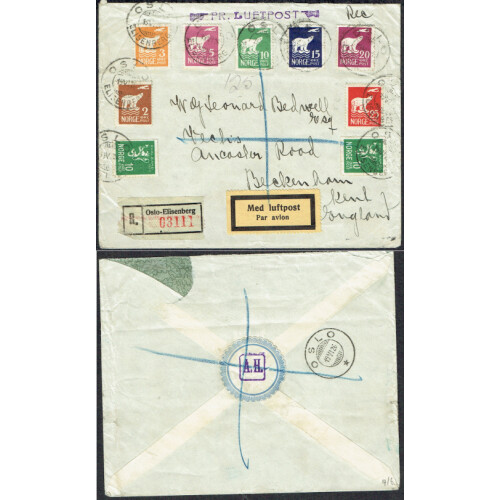 1926 (18 Jun) Registered airmail cover to UK bearing Polar Bear defin set 7 plus 2 10c green defins tied OSLO ELISENBERG cds cancels, tatty in places but nice multi franked cover.