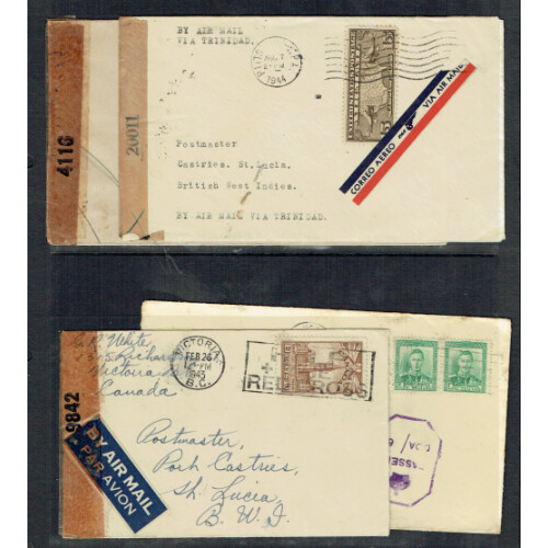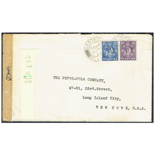 Useful postal history group mainly GVI periods including commercial covers to USA from Castries PASSED BY CENSOR to USA, 1944 Censor tape 7598 to NY, underpaid GV cover to Cayman Brac via Jamaica with p.due tied, OPENED BY CENSOR tapes (4), OPENED BY CENSOR etc, intr group, usual faults. (13).