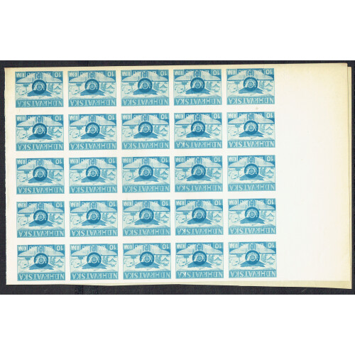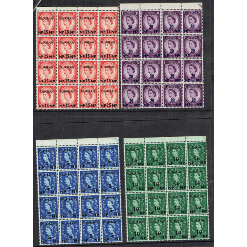 FUJAIRAH: Unauthorised overprints on QEII Wildings; British Postal Agencies in Eastern Arabia. Unauthorised overprinting in 1964 on 5np, 10np, 15np & 20np values each in top marginal block of 16 unmounted mint, prepared by Finbar Kenny to recover the costs of buying the postal contract off Baroody Stamp Co. However, the British Postal Administration rejected the design and they were not accepted for use. Scarce 'set' of four, interesting for any Middle East collection. (64).