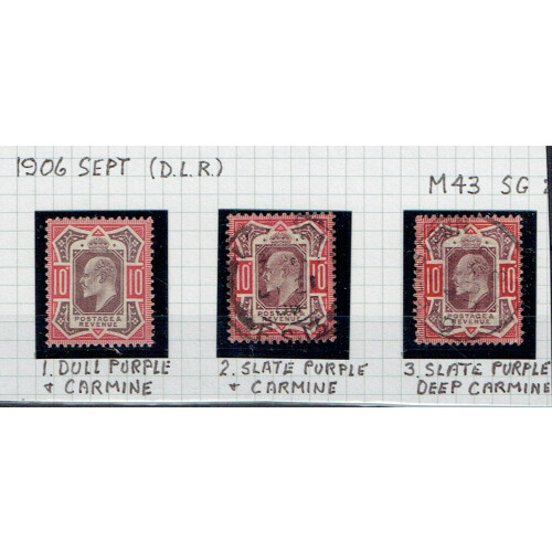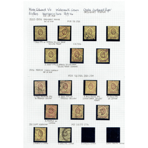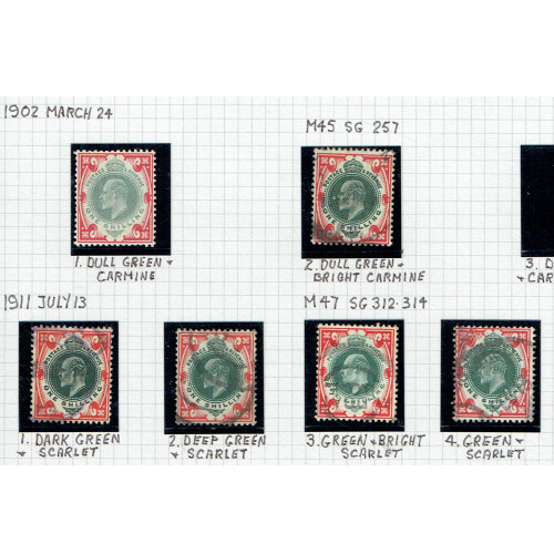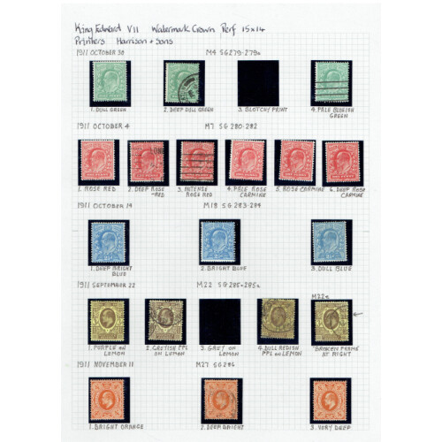 1906-1911 Mint, unmounted mint & used assembly of shades identified by SG specialised numbers includes 1911 1d rose-red (6 diff), 2½d mint (3 diff U/M), 3d purple on lemon mint, 3d cds used (3 diff one stated as broken frame taken 'as is'), 4d bright orange mint, very deep orange mint (U/M), deep bright orange cds used. 1906 5d dull purple and ultr. mint, slate purple used, plus pair cds used. 1910-12 7d grey black mint (5 shades one rule gutter margin some are unmounted). (29). High cat value.