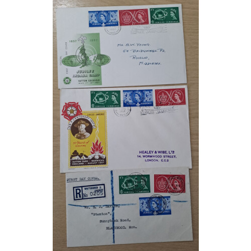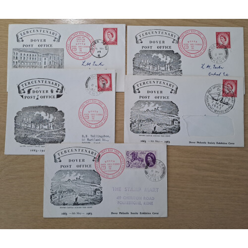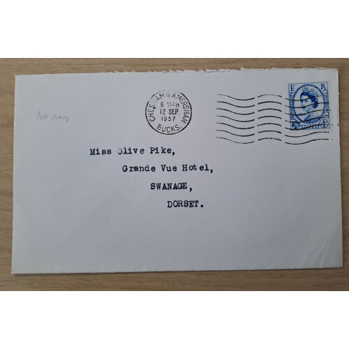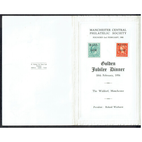 1956 (10 Feb) Manchester Central P.S. Golden Jubilee Dinner card bearing EDVII ½d blue-green and QEII Wilding ½d orange both overprinted MJPS / 1906, held at The Waldorf, Manchester. Few minor bends on the card which contains the menu and toasts. Intr.