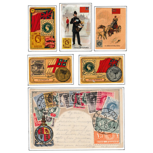 Ottmar Zieher Stamp Postcards (Circa 1905) collection neatly arrange on card leaves for 49 different countries mostly attributed to Zieher, couple of other publishers with many attractive cards both printed or embossed for the stamp montage designs for each country includes GB includes £5 EDVII design, Germany, Japan, Australian States, Straits Sett., ORC, NZ, Austria, Mauritius, Tunisia, Russia, German states, France etc, then good range of cigarette card types all with stamp related themes, would make wonderful first page of country collections etc, mostly very fine. (49 postcards).