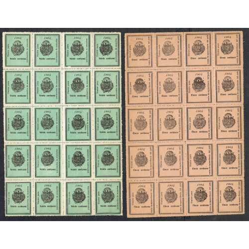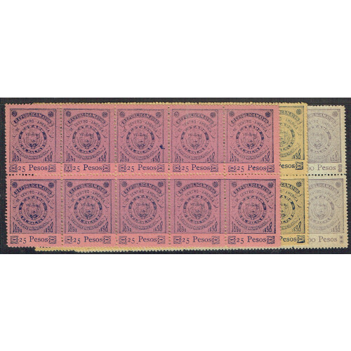 FUJAIRAH: Unauthorised overprints on QEII Wildings; British Postal Agencies in Eastern Arabia. Unauthorised overprinting in 1964 on 5np, 10np, 15np & 20np values each in top marginal block of 16 unmounted mint, prepared by Finbar Kenny to recover the costs of buying the postal contract off Baroody Stamp Co. However, the British Postal Administration rejected the design and they were not accepted for use. Scarce 'set' of four, interesting for any Middle East collection. (64).