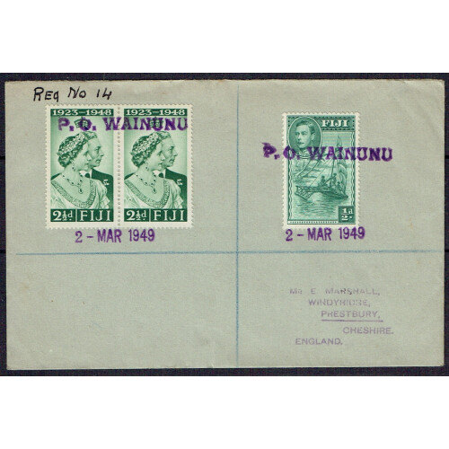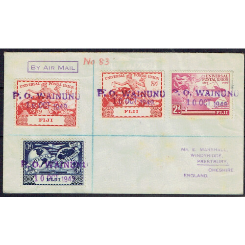 1949 (10 Oct) Registered cover (philatelic) to UK bearing 1949 UPU 2d, 3d & 8d (2) tied single line P.O. WAINUNU / 10 OCT 1949 struck on each stamp, manuscript No.83, few light tones, scarce cancels.