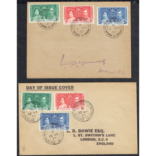 1937 Two Coronation sets on covers (2) to Stanley or London incl tied SOUTH GEORGIA cds, or PORT STANLEY cds. Fine.