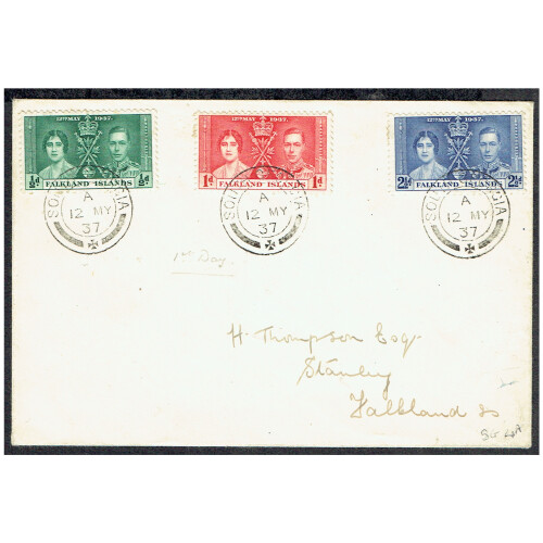 1937 (12 May) Coronation set on cover to Stanley tied SOUTH GEORGIA / A cds. Fine.