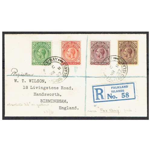 1927 (11 Mar) Registered WILSON cover bearing GV ½d, 1d, 2d & 2½ purple on yellow tied FOX BAY / C d/r cds cancels, neat regd etiquette of FALKLAND ISLANDS No. 58. Attractive album piece, SG range 73/77.