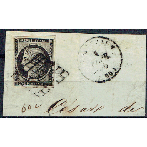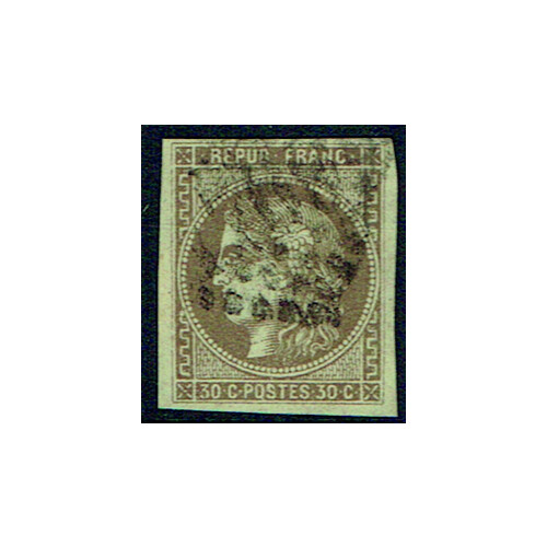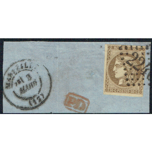 1870-71 30c brown very fine used large three margin example tied to piece from Marseille with part numeral dotted diamond cancel, superb. SG 175.