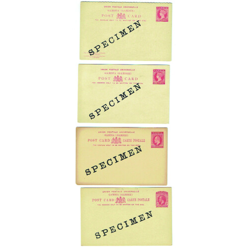 SPECIMEN Overprints on eight Queen Victoria reply card, registered P/S env. Includes QV 1d red Reply card, 1d red single card, 1½d grey with very small SPECIMEN in black (rare type), EDVII 1d single card, 2d blue registered env., GV 1d red reply card, 1d red single card & 1½d blue registered env. each with SPECIMEN diagonally across the centre in black on both sides. Nice group of 8 Specimen items.