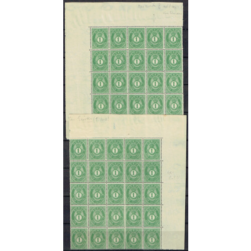 1871-75 1sk dark yellow-green in a top marginal sheet of 50 split into two panes of 25 (few perf splits) with right pane showing E.EN variety on position 18. Mainly fine, SG 33/33a. Cat £812.