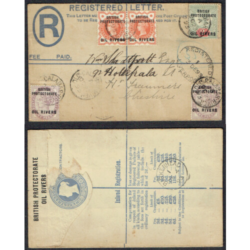 1893 2d blue registered uprated combination cover to UK bearing Oil Rivers ovpts on GB ½d vermilion pair, 1d lilac (2), 2d tied OLD CALABAR cds cancels, damaged flap otherwise high cat. SG 1/3.