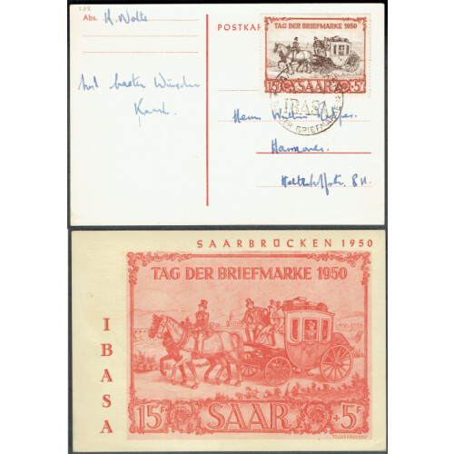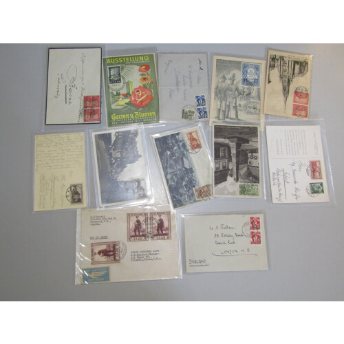 Covers group with useful rates including French Occupation 1947 4f on 16pf pair with 2f on 12pf combn to UK, 1949 Holo advertising env regd to Merzig from Wadern, 1925 Postcard with 45c Madonna on obv. 1951 Horticultural Show special show PPC (16 Jun, scarce), 1953 Red Cross special PPC, 1955 Stamp Day x 3 values on FDI, 1953 Stamp Day on special PPC, 1922 defins on covers (2), etc, interesting group (22).