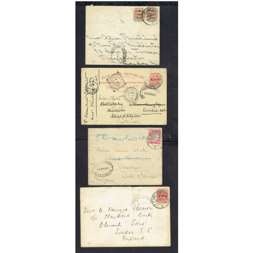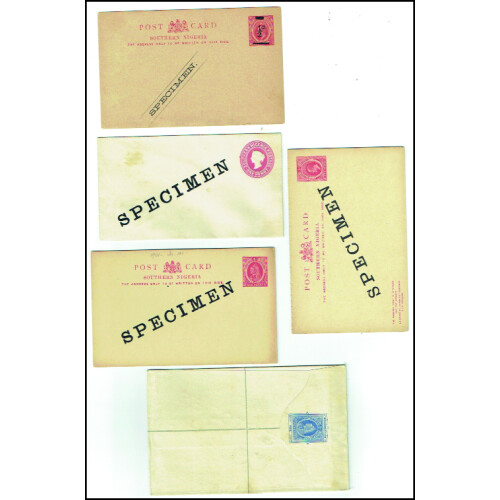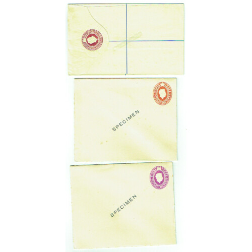 SPECIMEN Overprints on four Queen Victoria, two EDVII, four GV postal stationery cards and registered envelopes. Includes QV ½d green reply paid card printed Specimen diagonally on both parts, ½d green single card, ½d green newspaper wrapper, 2d grey Registered envelope, EDVII ½d green card, ½d green reply card, George Fifth ½d green reply card, ½d green single card, 1½d red single card, ½d green newspaper wrapper each with SPECIMEN diagonally across the centre in black. Nice group of 11 Specimen items.